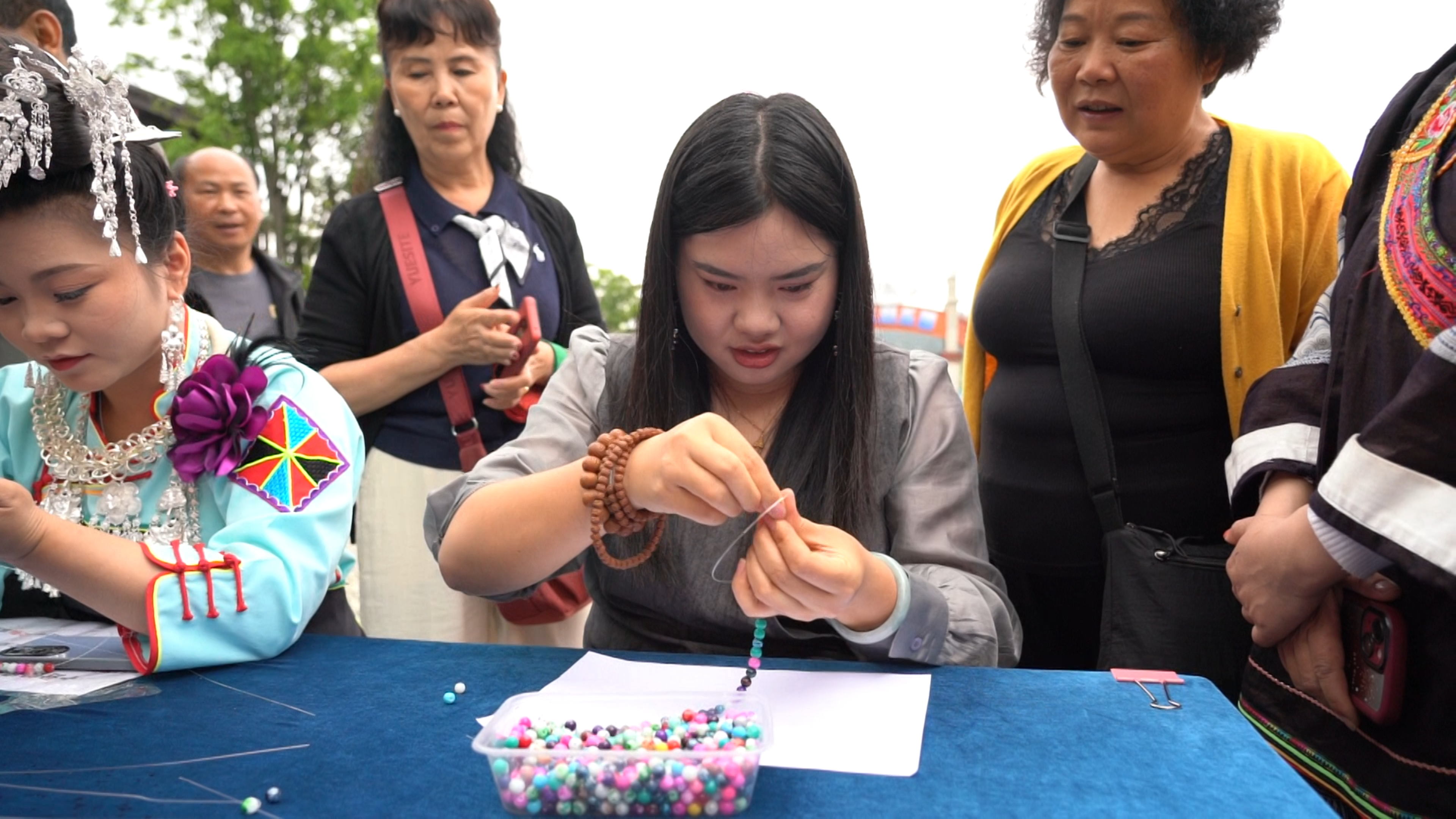 广场另一侧,手工串珠体验同样趣味十足。大家引彩线、捏细针,对准珠孔轻轻一穿,彩珠便稳稳滑入绳间。经过十分钟巧手制作,一串串精美手串陆续亮相。