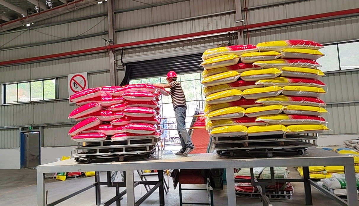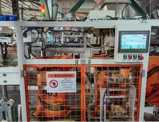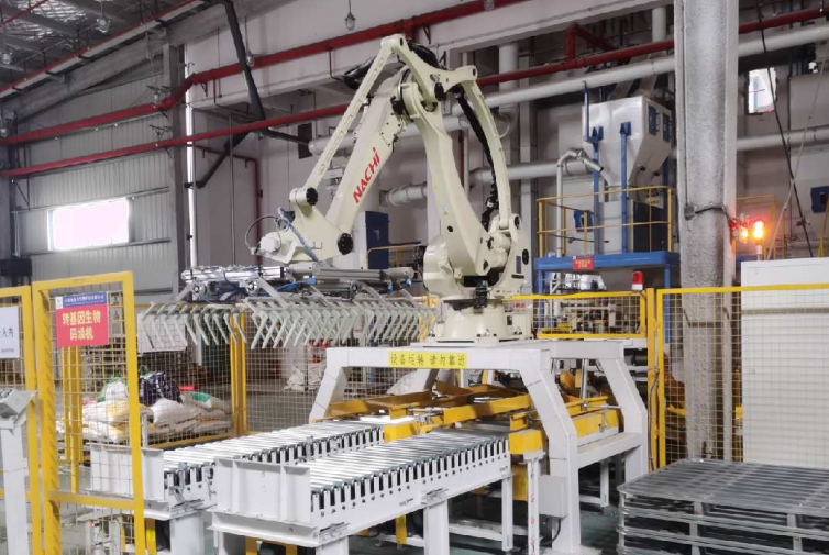 机器人码垛臂有节奏地运转,一袋袋生物饲料顺着传送带整齐堆叠。