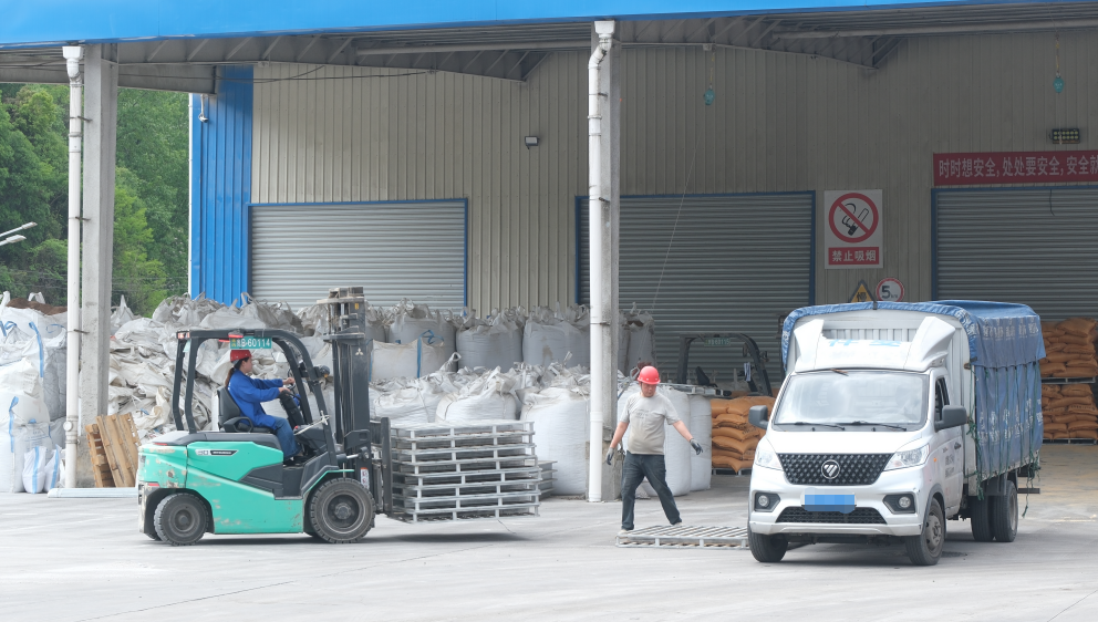 朱兴荣熟练地操作,将刚下线的产品转运至发货区——四年前,他还在运输行业,一年大部分时间在路上;如今,他每天骑车十分钟就能到厂,下班后还能陪孩子写作业。