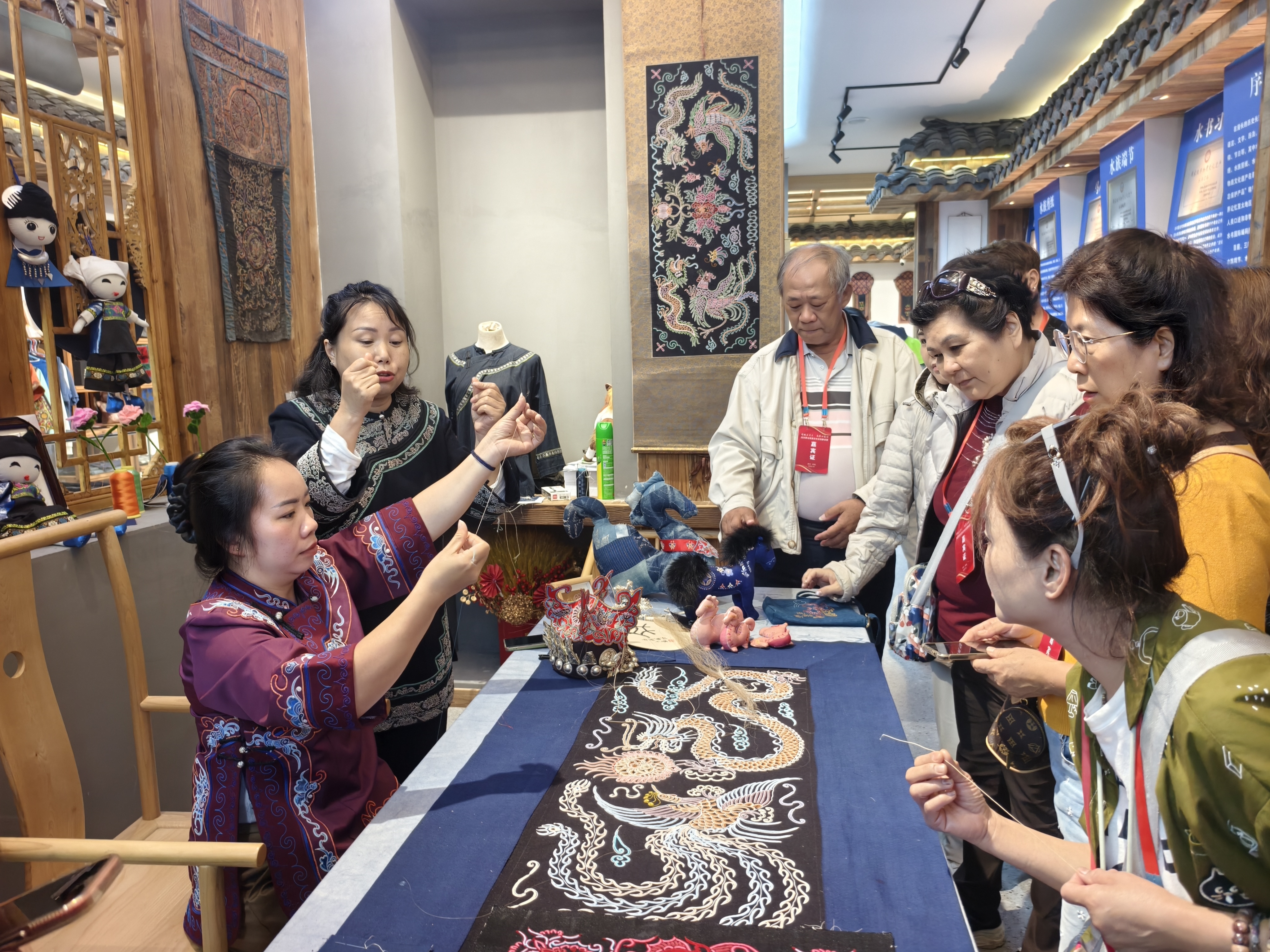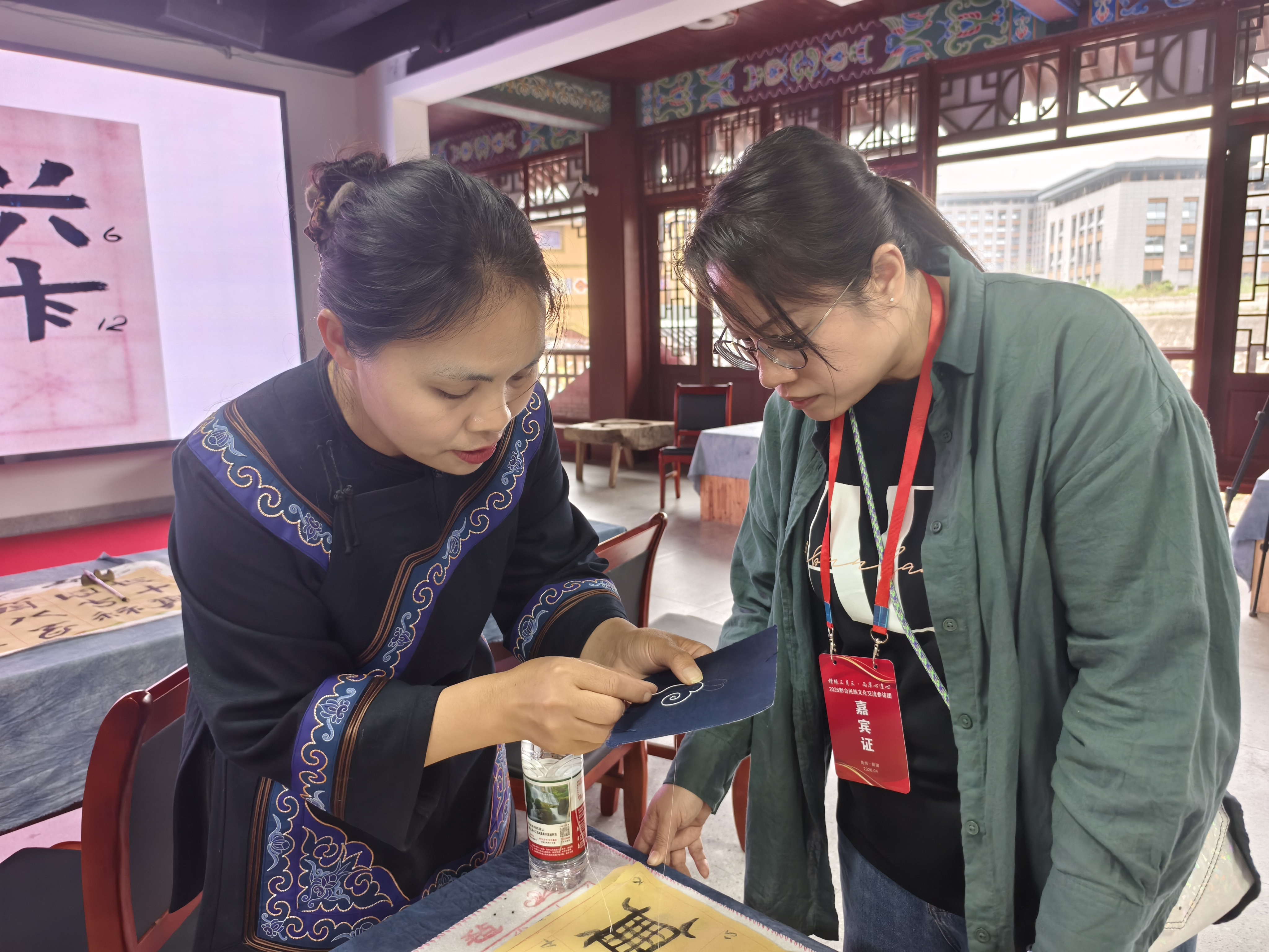 当天,交流团一行首先前往水族非遗项目体验中心。在体验中心,大家亲手尝试马尾绣刺绣技法,在一针一线的指尖流转中,真切感受文化底蕴,还通过解读水书字符、临摹简单水书文字等方式,触摸这一古老文字的历史温度,深入感悟水族文化的深厚积淀。