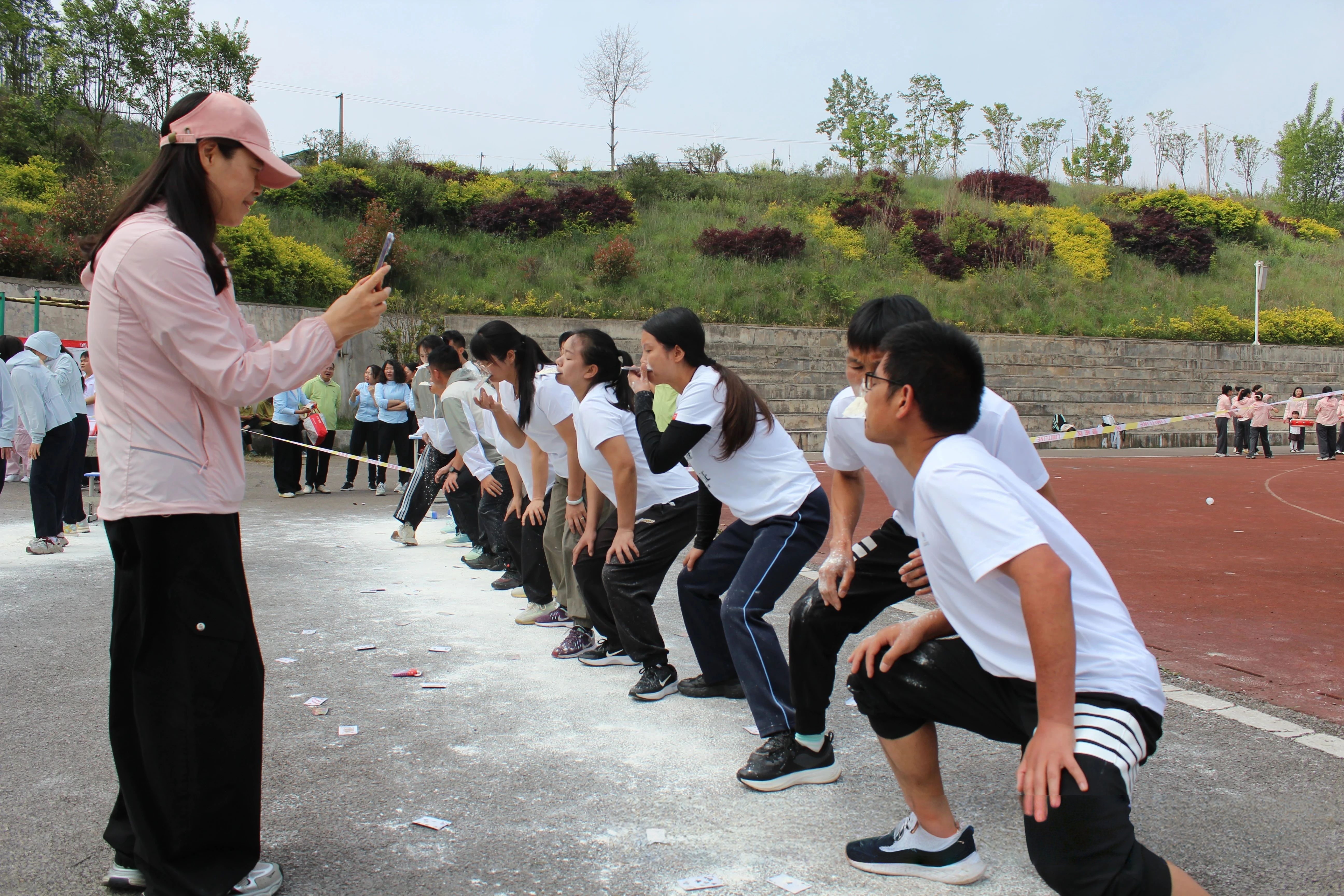 最令人动容的是“年年有余”项目。十名老师口含纸牌,托举面粉依次传递至终点容器。大家心往一处想,紧咬纸牌,精准控制面粉量,追求速度更追求稳度。这一刻,团队的默契与包容成为最动人的风景。