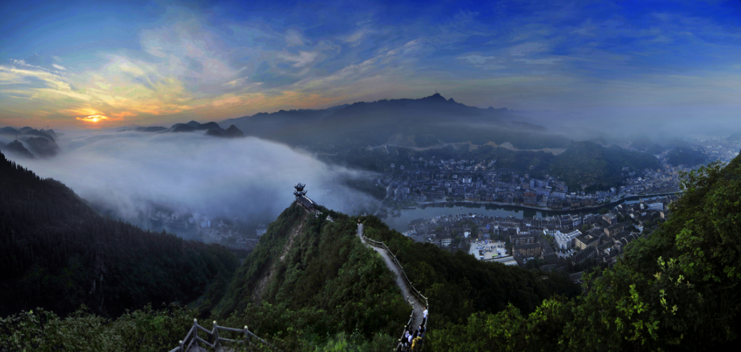 石屏山崖壁陡立如屏风,故名“石屏”。登顶远眺,㵲阳河呈S形蜿蜒穿城而过,将古城一分为二,北岸为旧府城、南岸为旧卫城,一幅天然的太极图在脚下徐徐展开。山巅之上,还保留着始建于明正德年间的府城垣,全长约2公里,由青石砌筑,沿山脊蜿蜒,被称为“苗疆长城”。穿行其间,脚下是千年古城的烟火人间,眼前是青山绿水的水墨长卷,历史的厚重与自然的壮阔在此交汇。