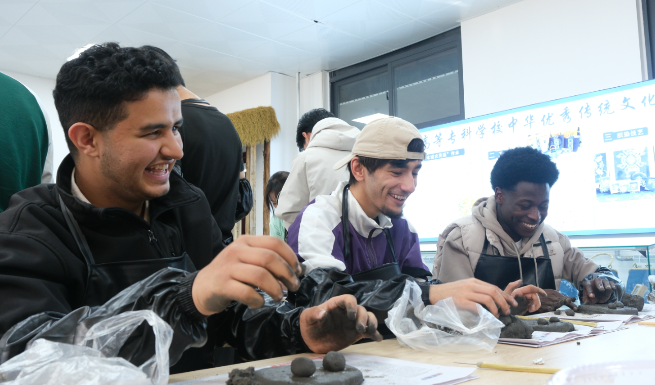 来自肯尼亚的学生经过三次尝试,终于成功拉出一个小罐。他兴奋地举起作品,脸上写满成就感。工作室里,不同语言的轻声交流与专注创作的身影交织在一起,构成一幅和谐动人的画面。