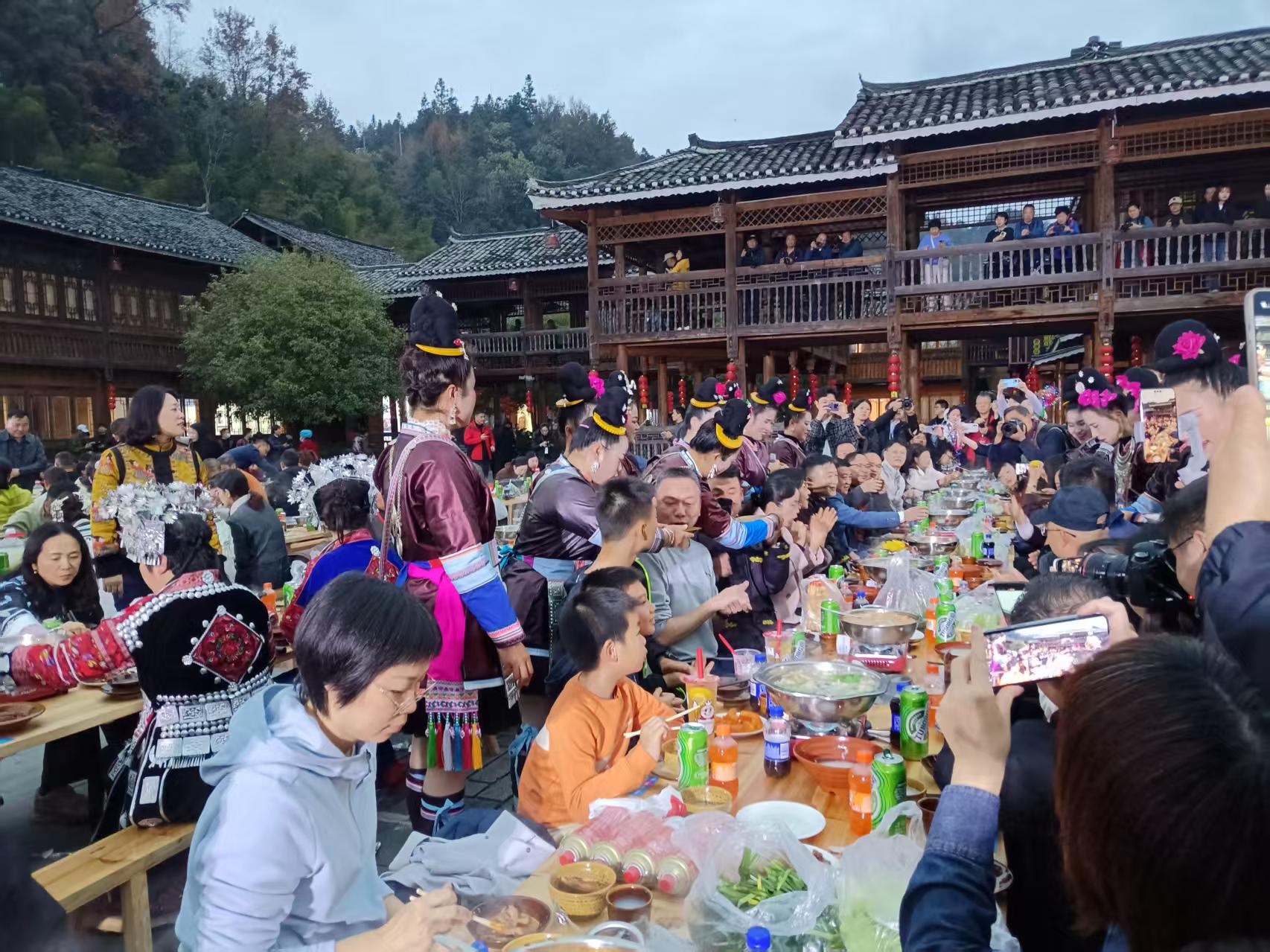 饭罢茶毕,侗家人诚邀四海宾朋、八方游客,齐聚村歌舞台,一起跳村舞、蹦侗迪。大家以歌舞为桥,让民族文化对话世界;以活动为引,激活肇兴侗寨发展新动能;以文创为翼,推动传统与现代共振,唱响民族融合、民族团结的最强音,也诠释“四海一家”的侗年本真,更擦亮乡村古镇“金名片”。