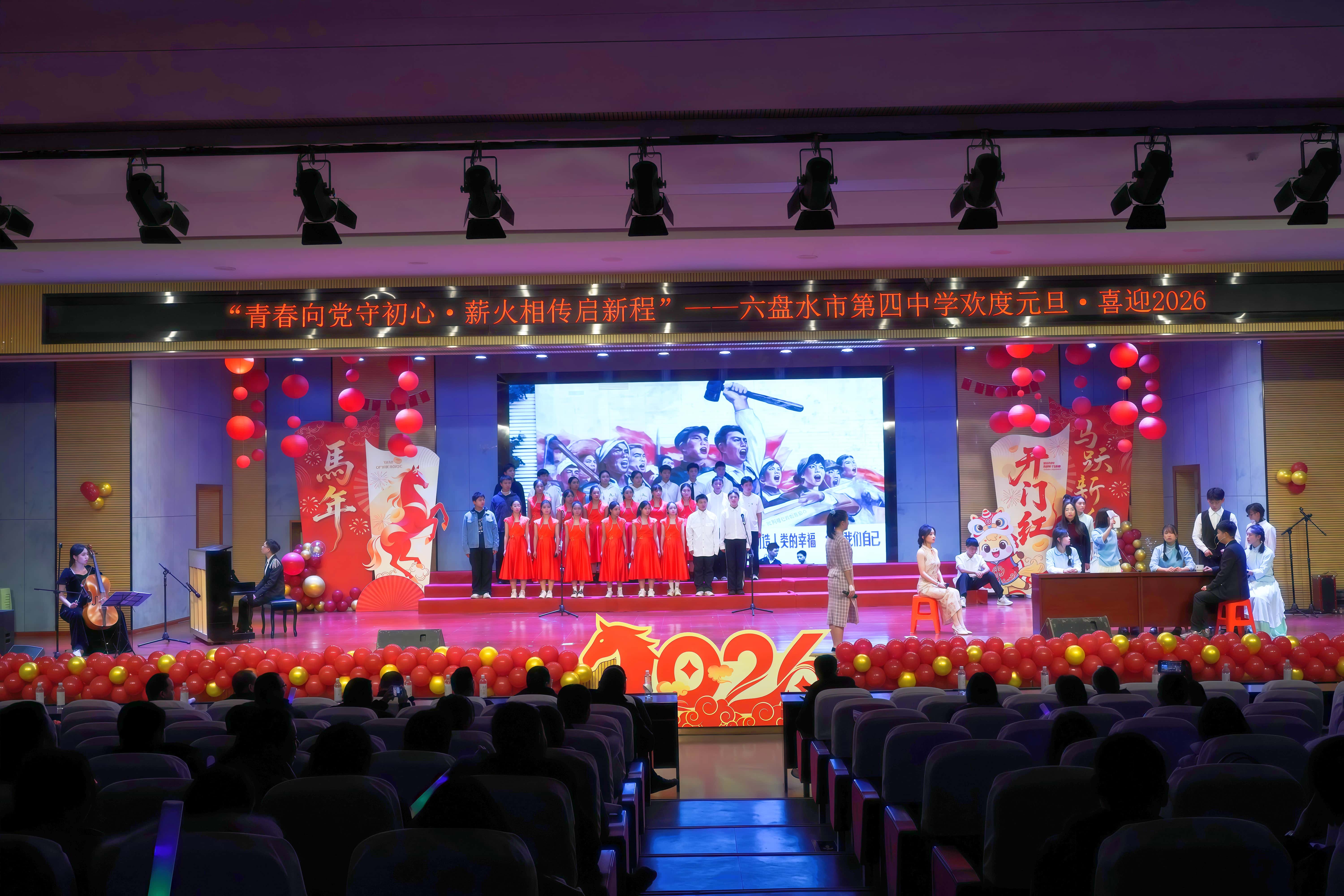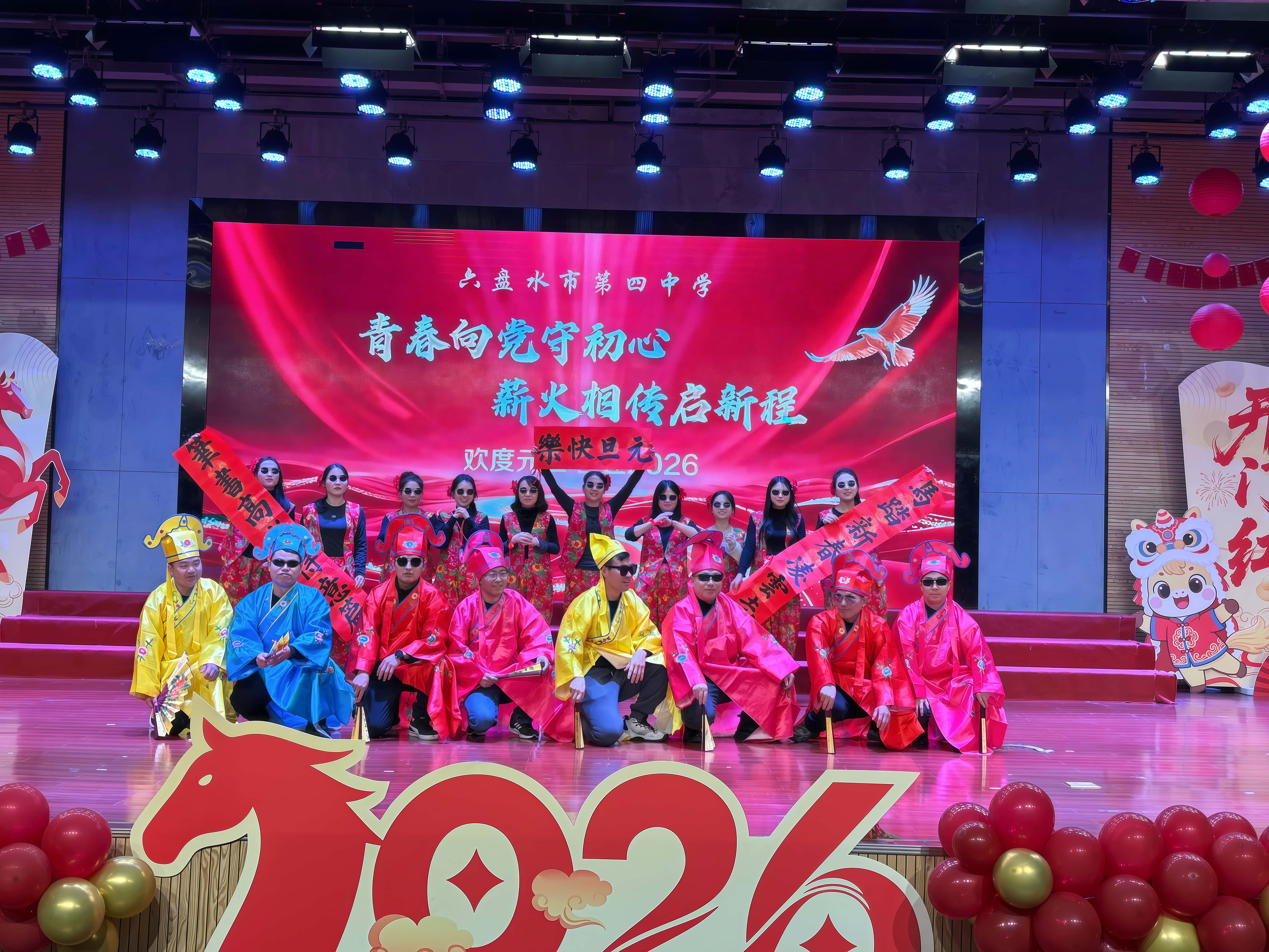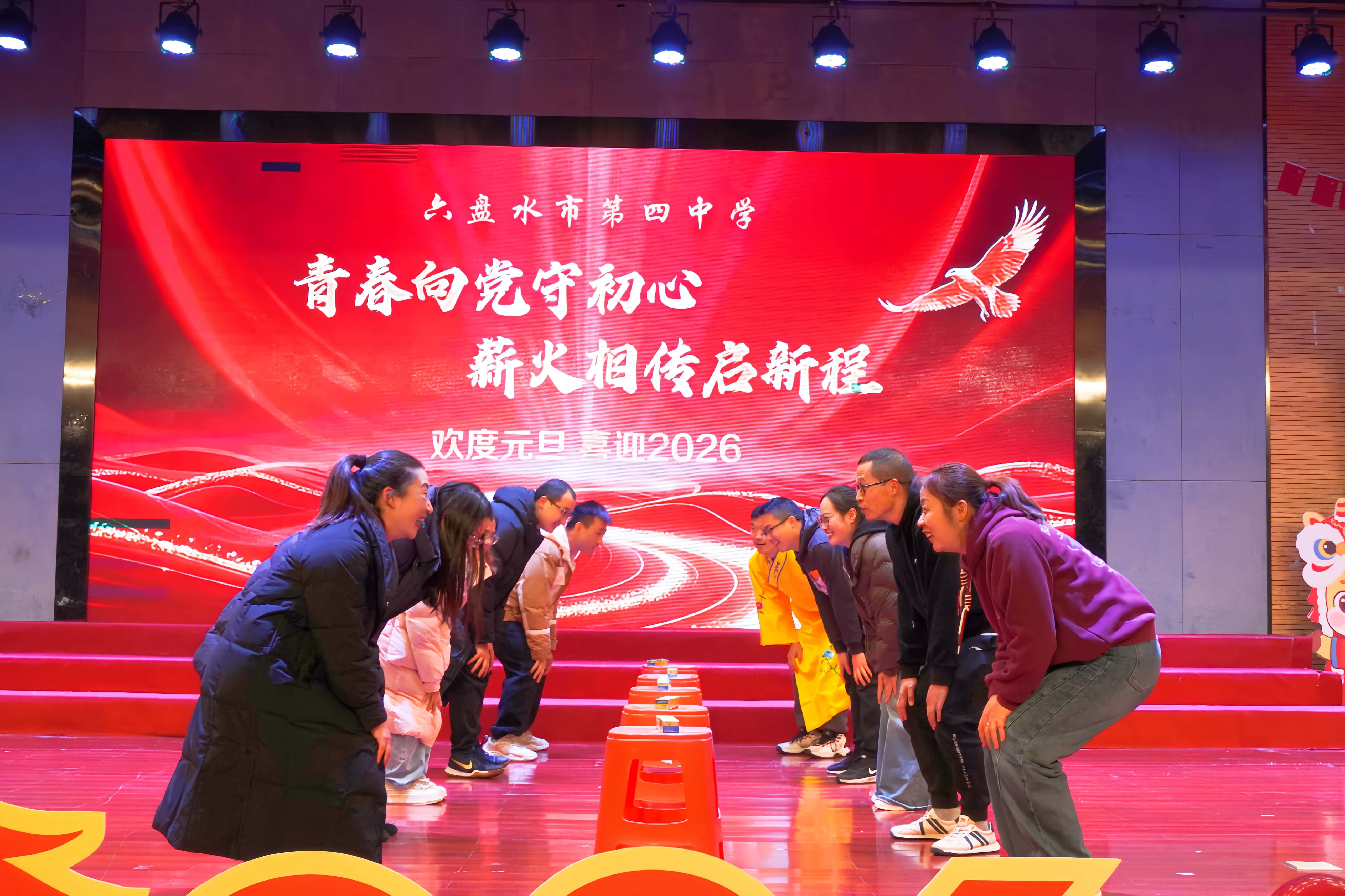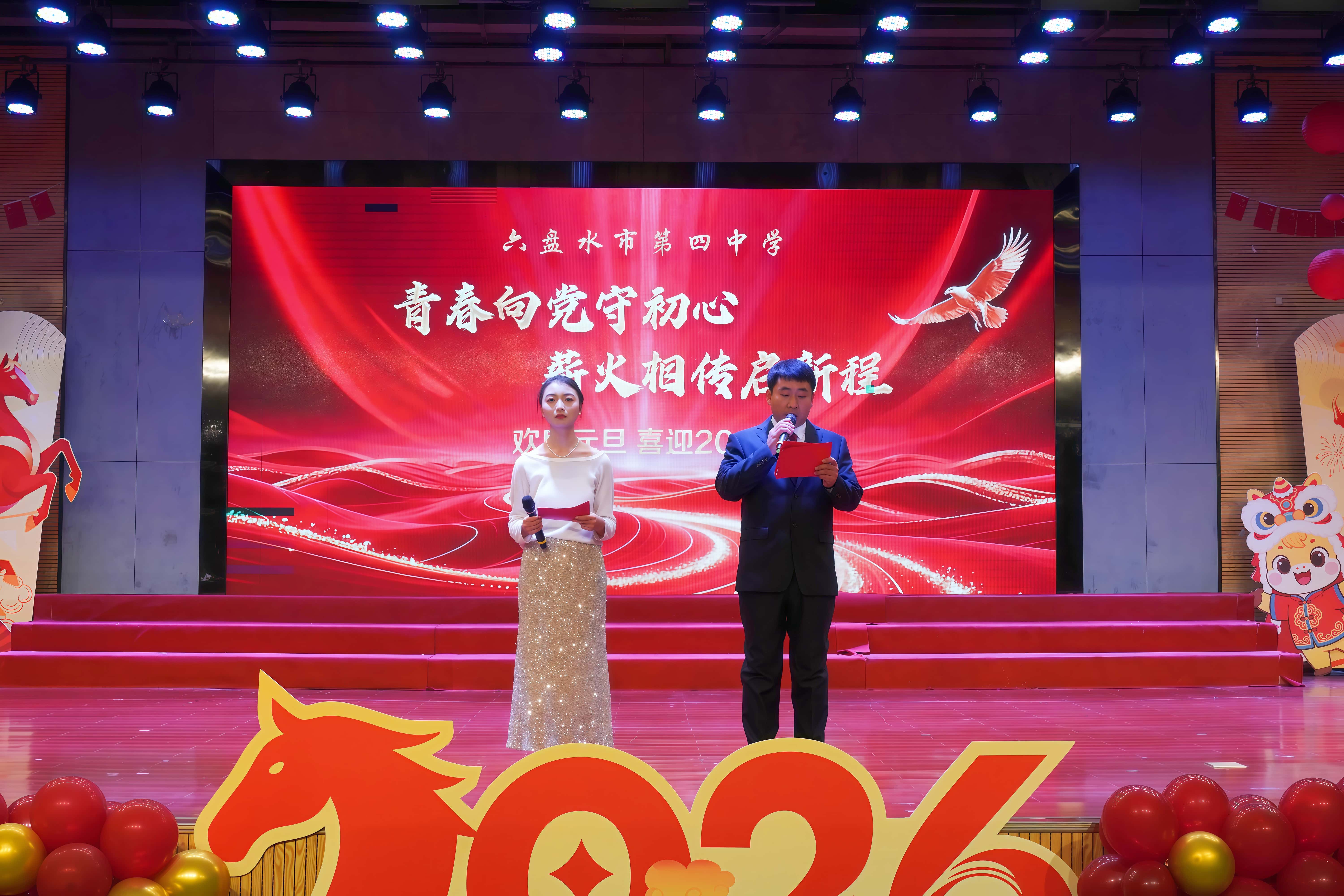 12月31日下午,六盘水市第四中学礼堂内灯光璀璨、笑语盈堂,学校全体教职工欢聚一堂,举行2026年元旦联欢活动。活动以“青春向党守初心,薪火相传启新程”为主题,通过歌舞、游戏、致辞等多种形式,共同回顾过去、展望未来,凝聚奋进力量。