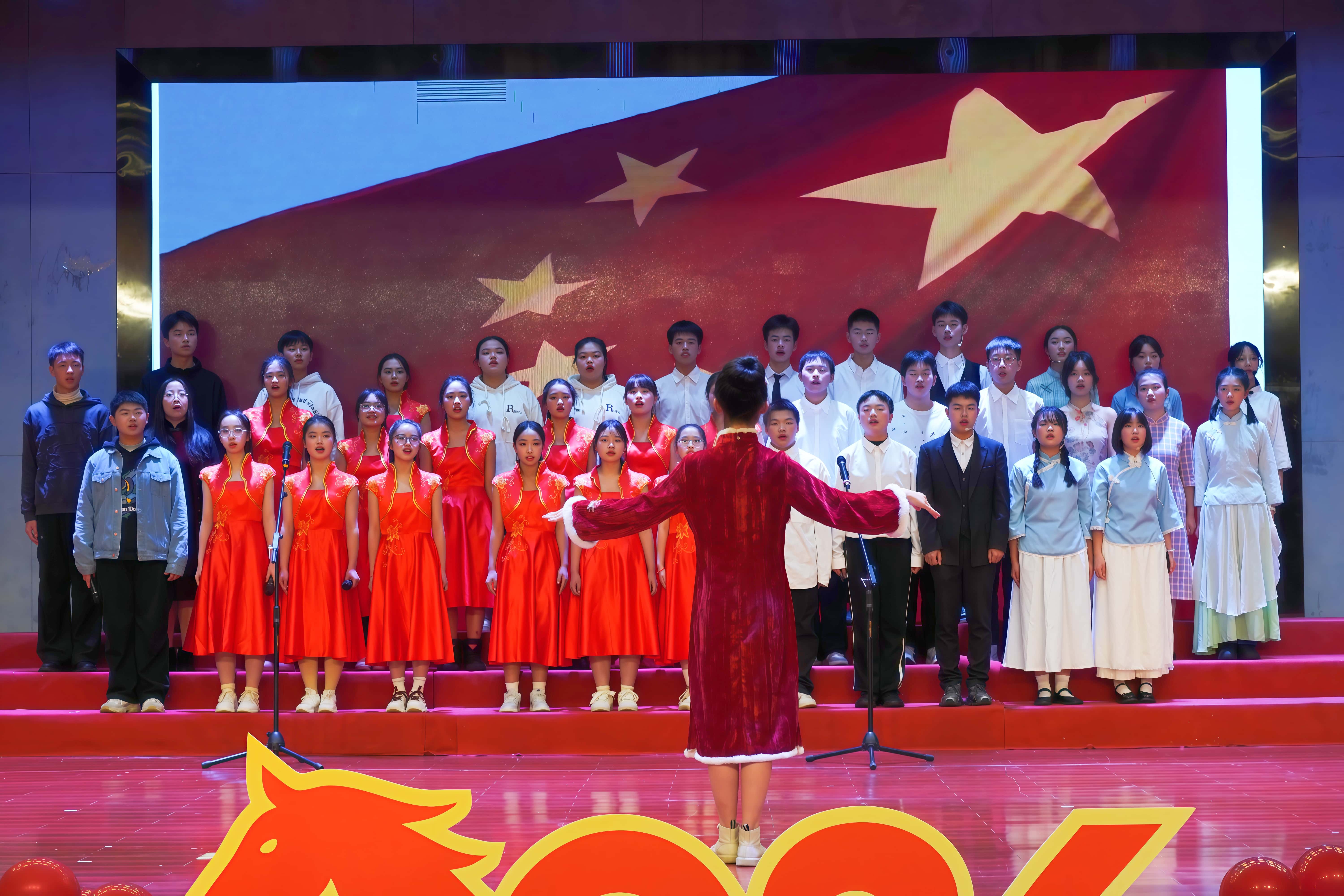 联欢会在激昂的青春旋律中拉开帷幕。高一2851班合唱《我和我的祖国》、高二A2722班演绎《紫荆花盛开》、初二(3)班唱响《明天会更好》……同学们用真挚的歌声传递爱国情怀与青春梦想,为整场活动注入蓬勃朝气。