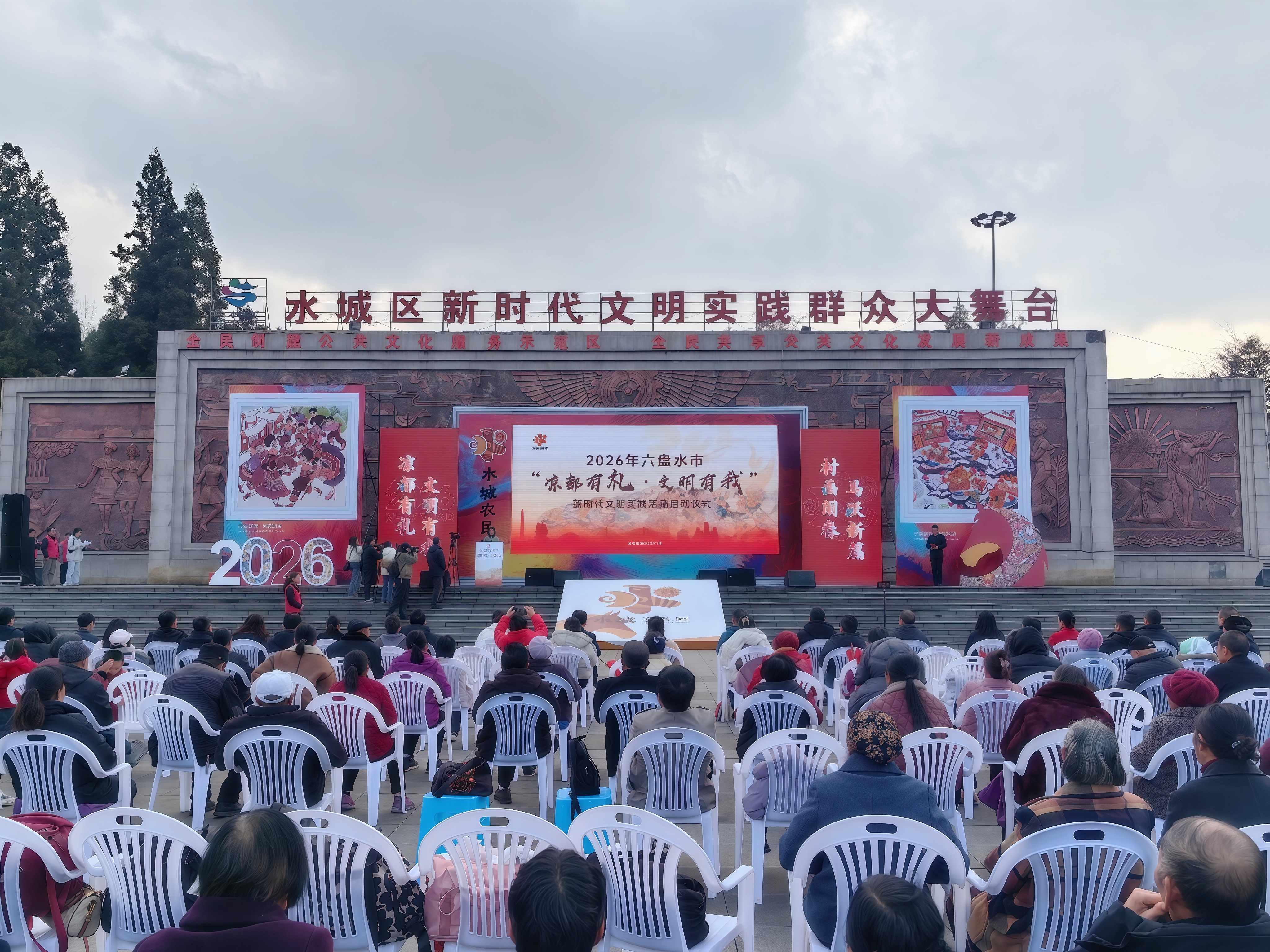 12月31日,六盘水市在水城区双水大广场举行2026年“凉都有礼·文明有我”新时代文明实践活动启动仪式暨“村画闹春 马跃新篇”水城农民画新时代文明实践系列活动,进一步推进精神文明建设和文旅融合,培育社会文明新风尚。