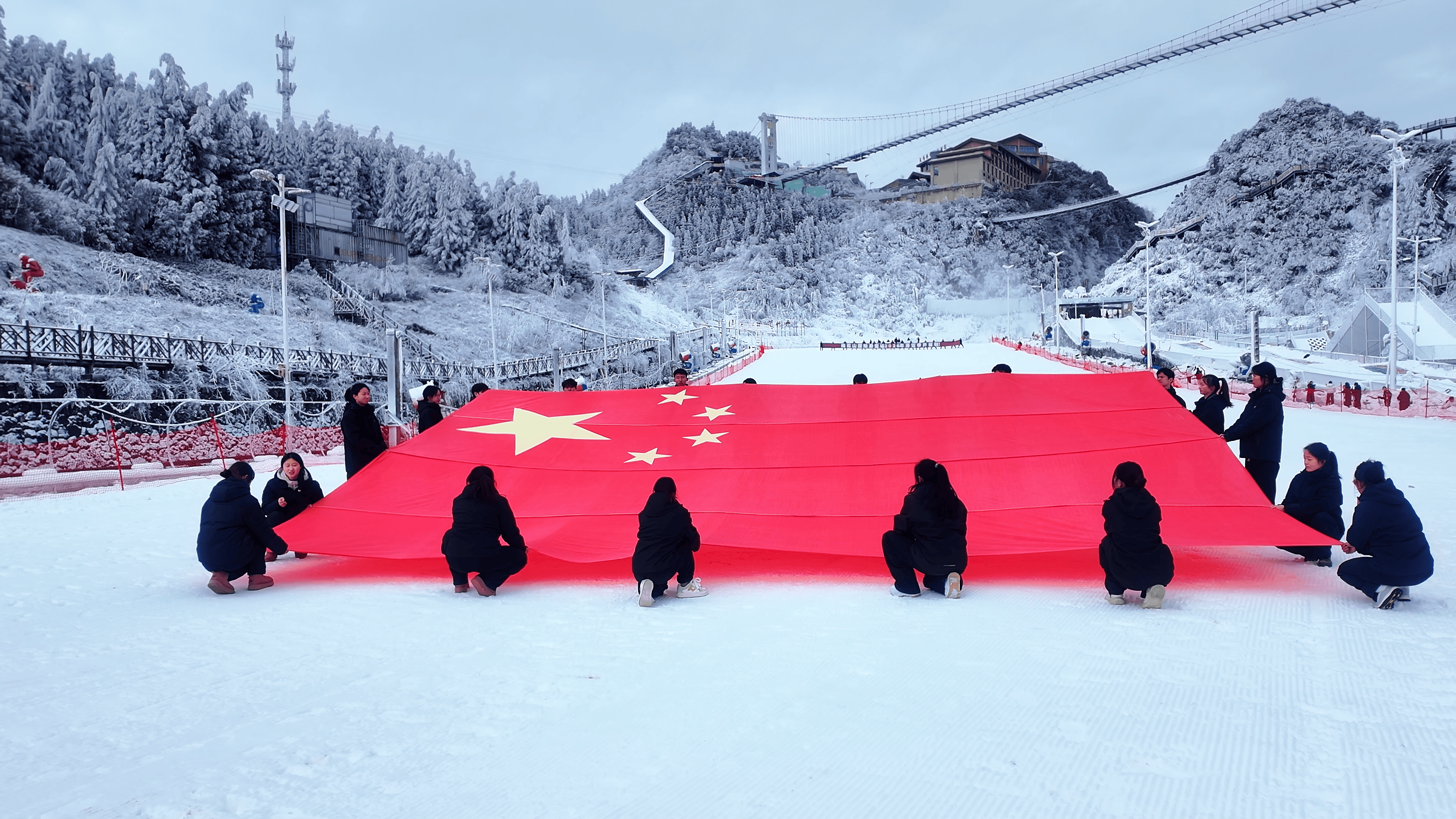 开板仪式上,国旗方阵滑雪表演成为动人一幕——专业运动员手执国旗,驰骋雪道,将冰雪运动的激情与家国情怀融为一体。雪季期间,景区还将推出春节民俗喜乐会等系列活动,持续丰富冬季文旅产品供给。