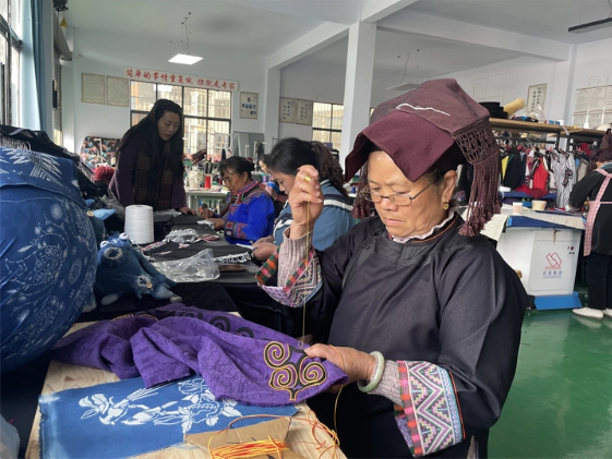 在贵州盘州市淤泥艺胜民族民间旅游产品有限公司的工坊内,十余名妇女正埋头于手中的绣布。丝线穿梭间,精美的民族图案渐次浮现。角落里的车祥花,身着彝族传统服饰,虽行动不便,双手却灵活而稳健。在这里,她每月能获得约3000元的稳定收入,从“家庭负担”变成了贡献力量的人。