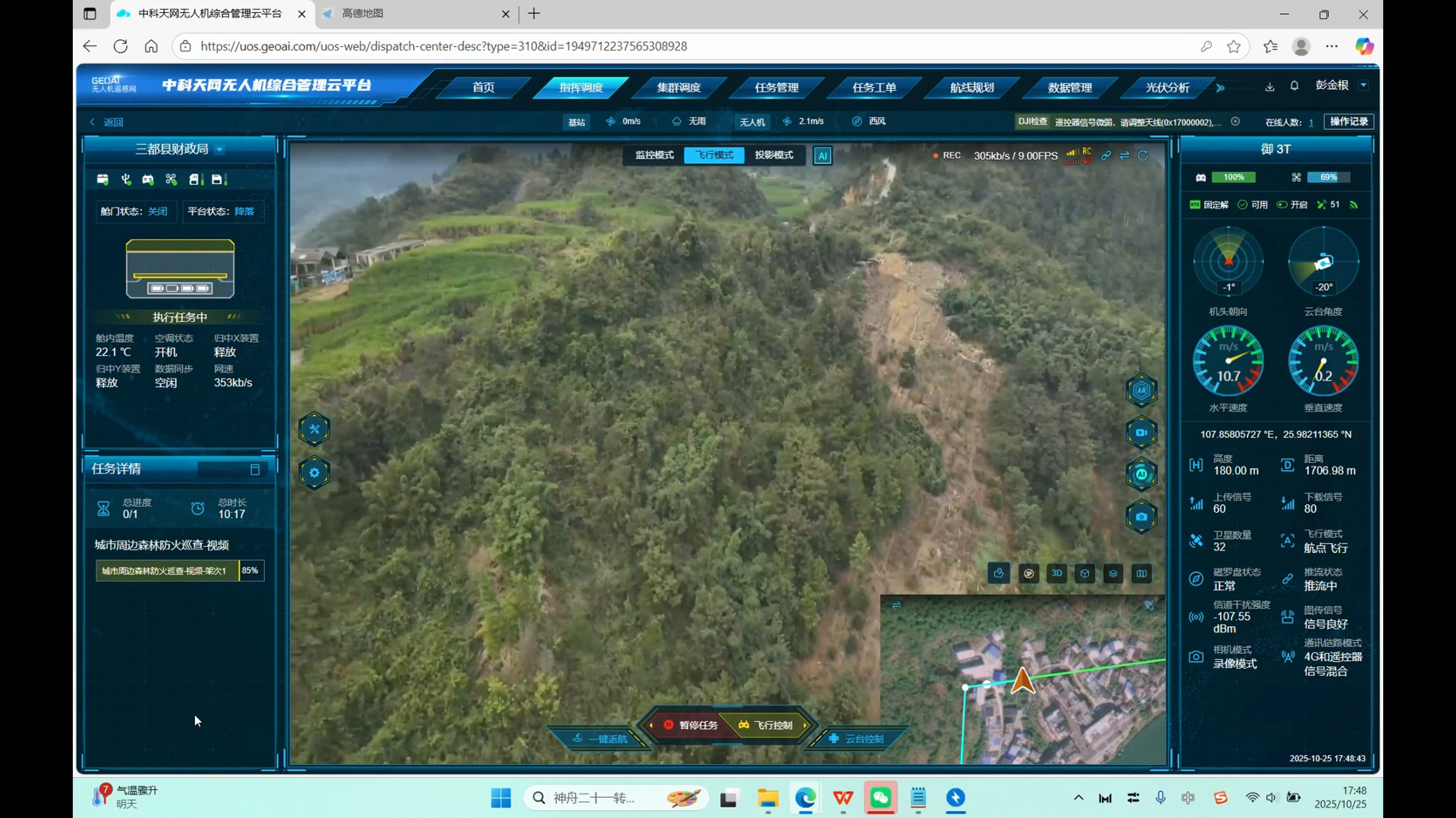 三都自治县山地多、林地广,传统巡查受限制,在森防、水域防控、矿产监管等工作中存在“看得见走不到、走得到看不全”的困境,无人机系统的精准落地破解了这一难题。这些无人机功能互补,核心作用覆盖多领域安全防控:搭载高清可见光摄像头与红外热成像设备,具备AI智能识别、自动巡航、远程喊话、数据实时回传等功能,可实现全域覆盖监测预警。传统护林员日均徒步巡查约20公里,而无人机一小时即可完成50平方公里全覆盖,效率提升数十倍。无人机AI算法可精准识别烟雾、明火等异常,3分钟内完成“发现火情—定位坐标—推送预警”全流程;指挥中心同步调度载重灭火无人机赶赴现场压制火势,为地面驰援争取黄金时间。