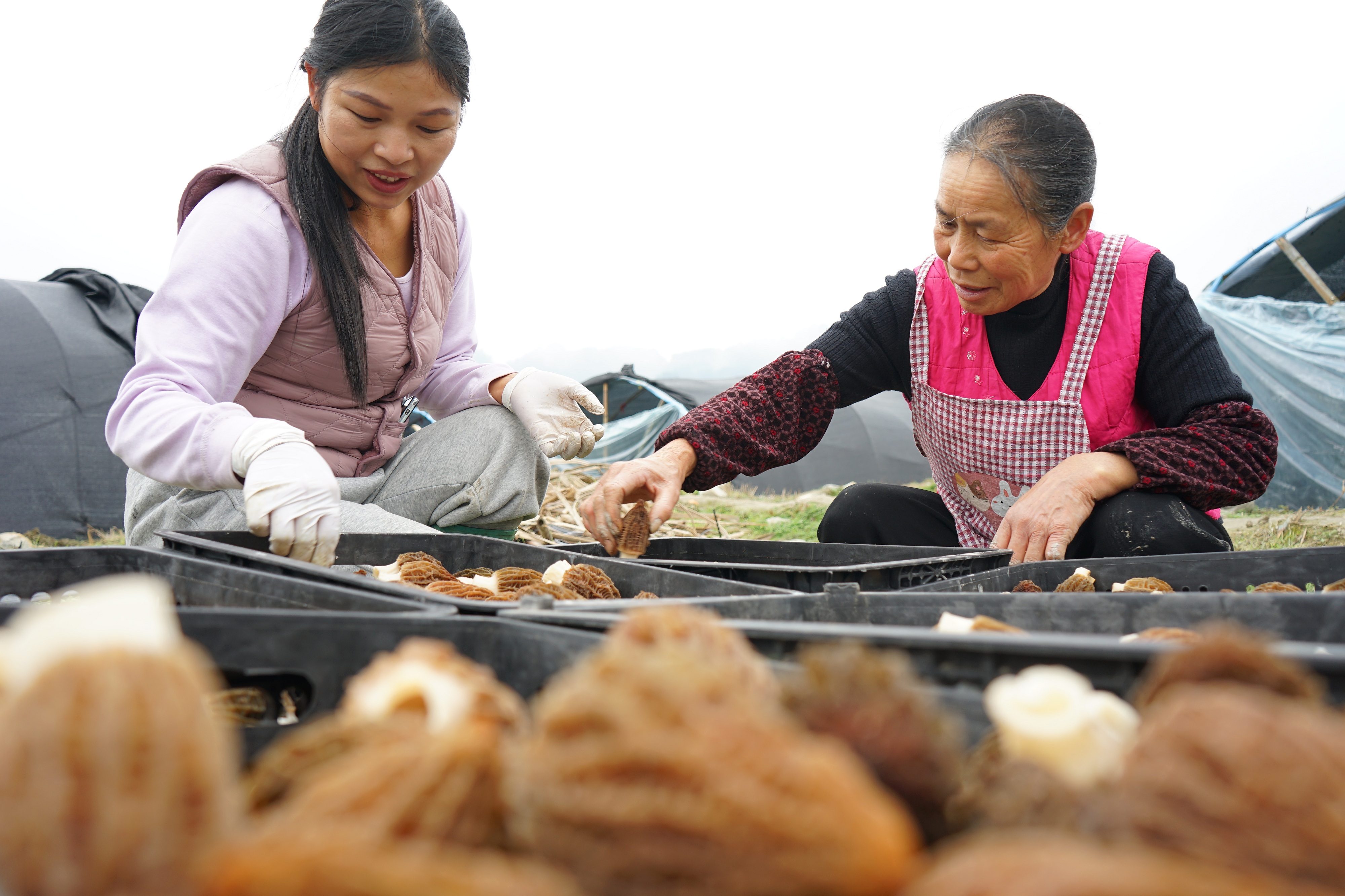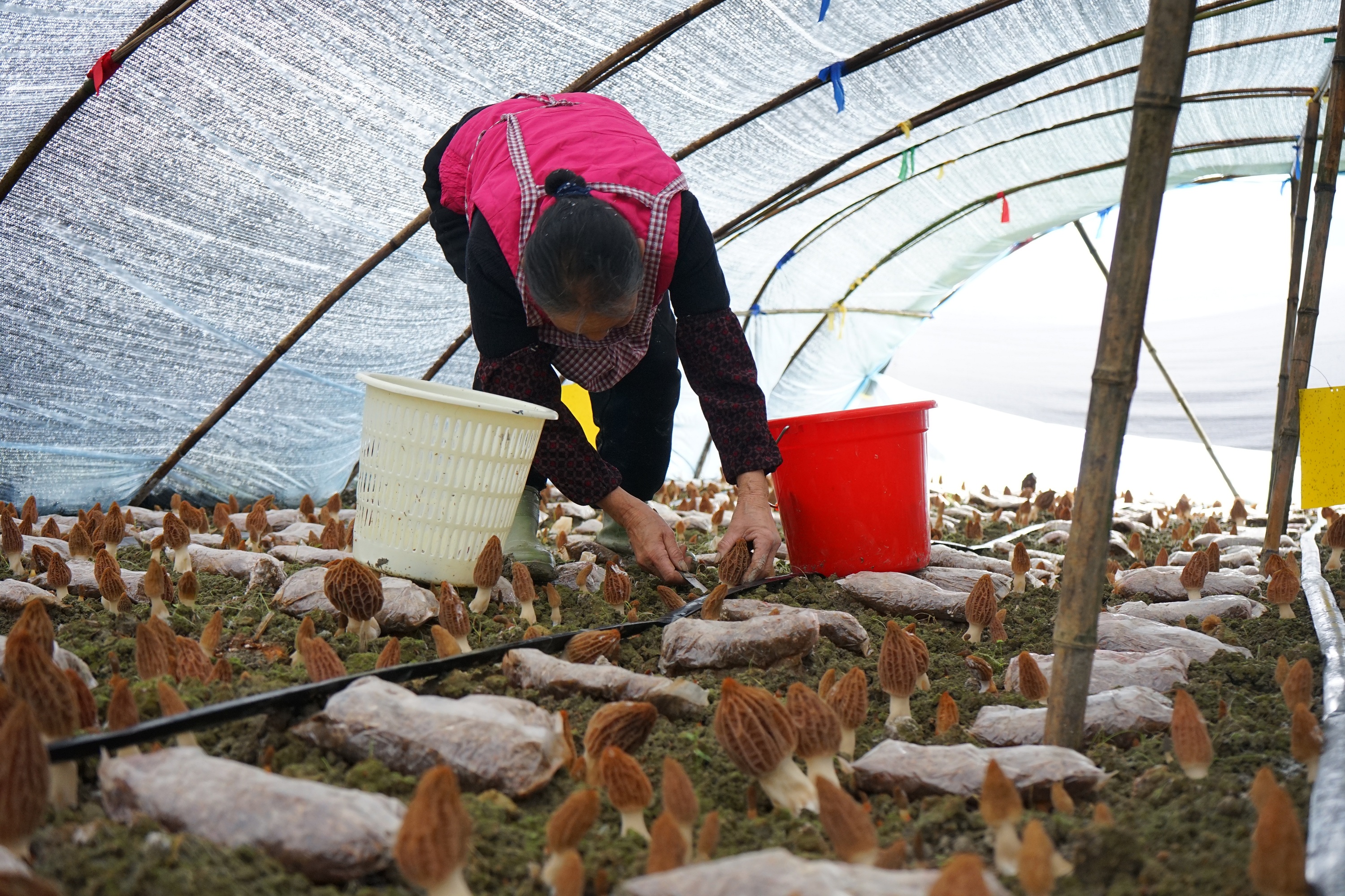 在采摘队伍中,一位手脚麻利的妇女格外显眼。“以前种地一年忙到头,挣不了几个钱,现在在家门口就能挣钱,一个月能挣2500元,还能照顾小孩读书!”她捧起刚摘的羊肚菌,朴实的笑容里满是满足。羊肚菌种植属于劳动密集型产业,整地、搭棚、播种、采菇等每个环节都需要人力,基地规模扩大后,不仅激活了本地闲置劳动力,更让许多妇女实现了“就业顾家两不误”。