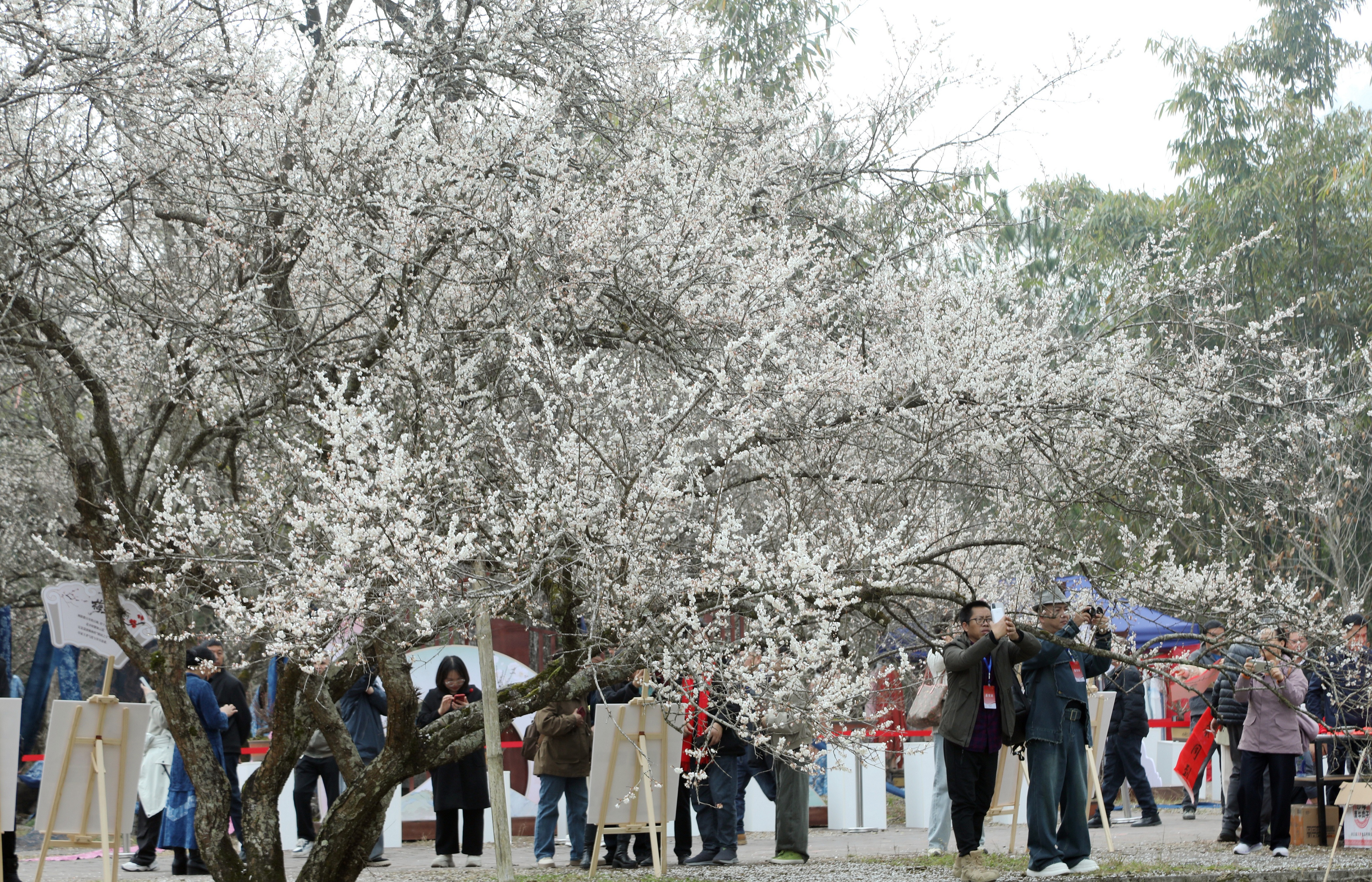 步入梅园,清冽梅香沁人心脾,花瓣随风轻舞,游人穿梭其间,或驻足细品,或拍照留影,欢声笑语萦绕林间。“专门为这片‘香雪海’而来,太震撼了!”游客贺士荀一边与梅枝合影一边赞叹,“眼下梅花开得正艳,风一吹花瓣轻飘,拍照氛围感拉满。”除了沉浸花海,游客还能参与汉服巡游、梅花仙子互动、“岁寒三友”文化体验、青梅煮酒、梅林清音等特色活动,在品味文化韵味中感受春日浪漫。精品梅花展、梅原脱口秀、健康跑、乡村气排球赛等新增活动,更推动旅游体验从“走马观花”向“深度沉浸”转变。