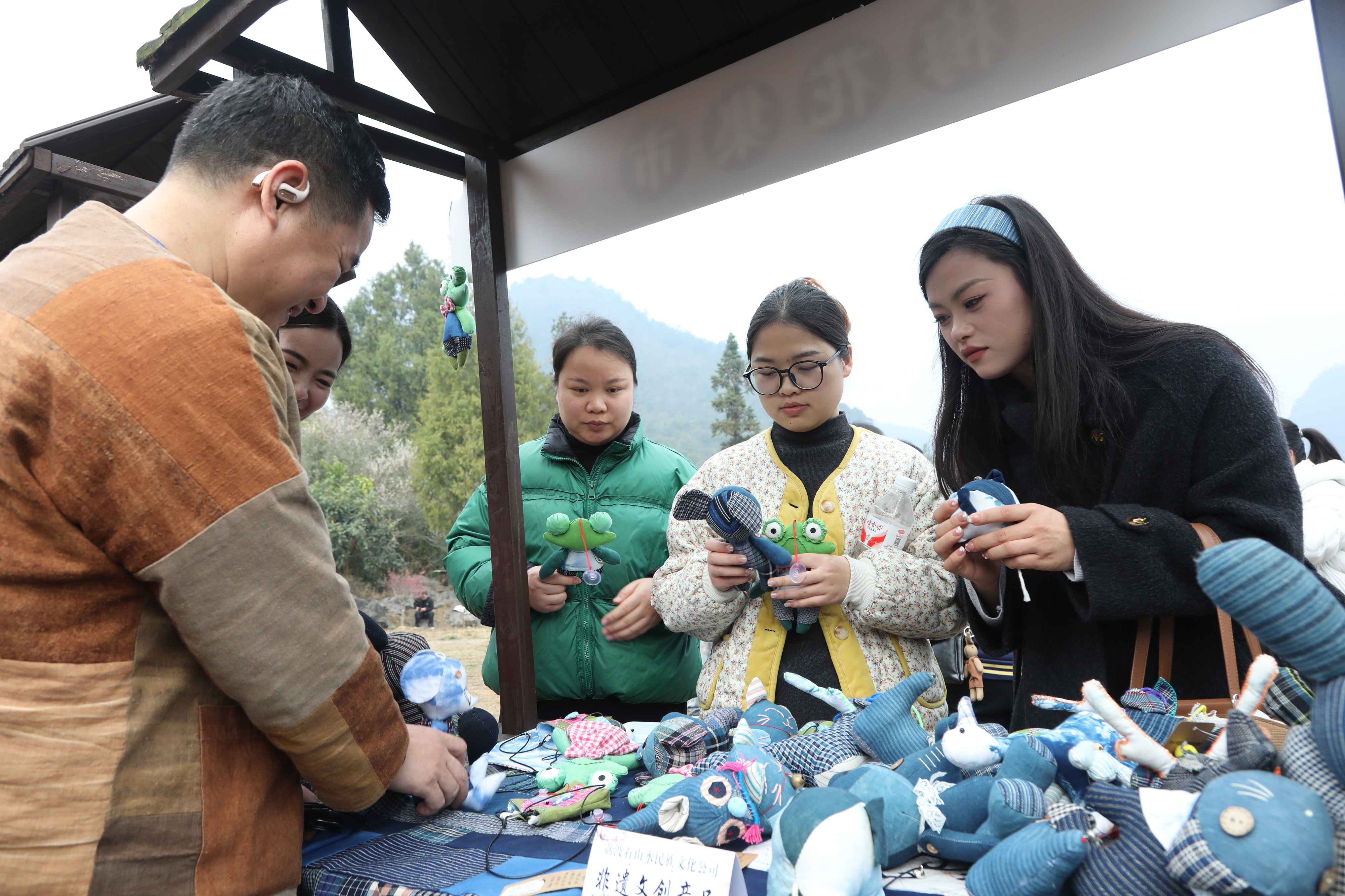 “既能赏梅打卡,又能感受梅文化,体验感特别好。”广东游客陈慧贤点赞道。不少“回头客”也感慨:“坐在梅林里赏花吸氧,十分惬意,每年都有新惊喜。”梅香引客来,热闹了乡村,更富了百姓。“花经济”不仅带旺了旅游人气,更有效带动农产品销售和农民就业,让村民的“钱袋子”越鼓越实。梅花集市上,青梅酒、腊肉香肠、板寨红米、非遗文创等特色产品琳琅满目,游客争相选购。“今年梅花开得好,游客特别多,我的青梅果茶、青梅干都卖爆了,忙得心里美滋滋。”木朝村村民田孟泽的小摊前客流不断。贵阳游客蔡君手里拎着非遗玩偶和青梅酒笑着说:“这些特色年货很有味道,自己囤点,也给亲戚朋友带几份。”