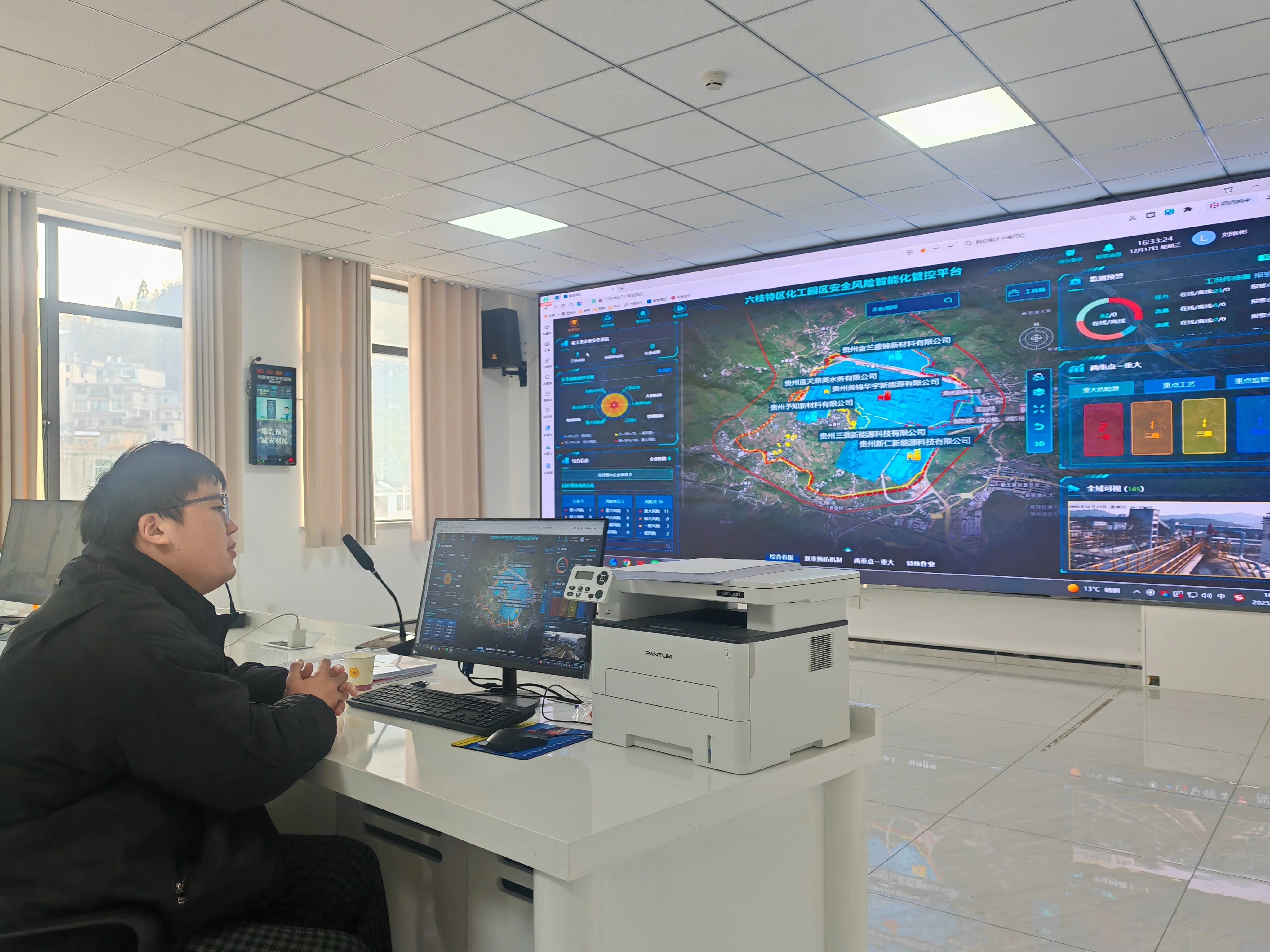 在园区应急指挥中心,只见当值的工作人员刘维彬坐在电脑边,眼睛盯着前方的大屏幕,将园区内的所有企业“尽收眼底”,手里还不时点击鼠标,查看每个企业的生产情况、安全情况。
