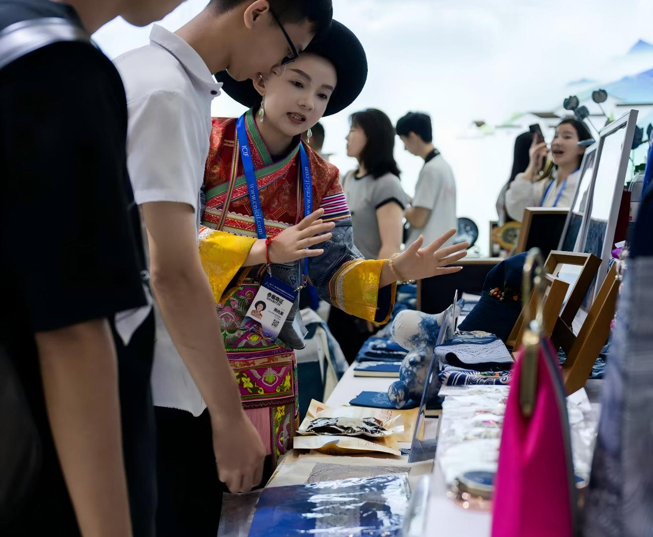 非遗传承人熊兆美在深圳文博会展位上介绍蜡染文创产品
