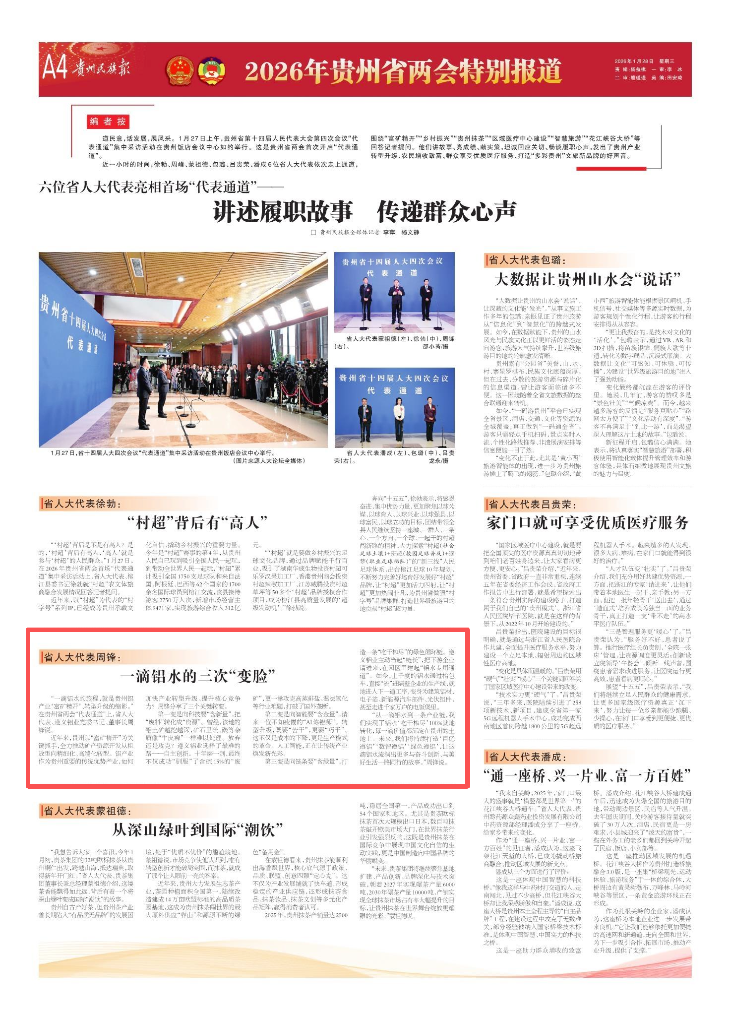 “一滴铝水的旅程,就是贵州铝产业‘富矿精开’、转型升级的缩影。”在贵州省两会“代表通道”上,省人大代表、遵义铝业党委书记、董事长周锋说。