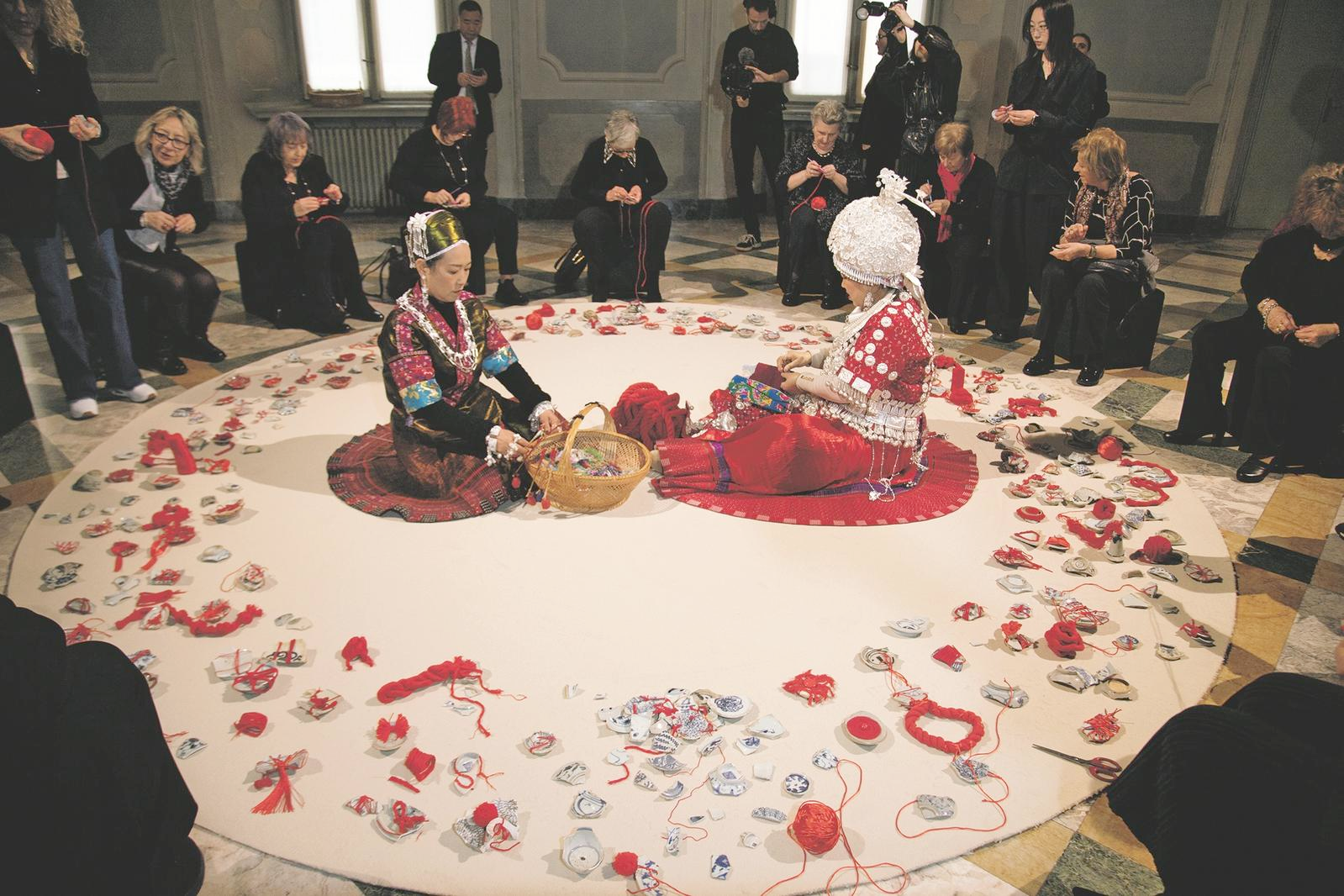 在2025年米兰时装周上,龙禄颖(左)与国际友人交流苗绣技艺。(资料图片)