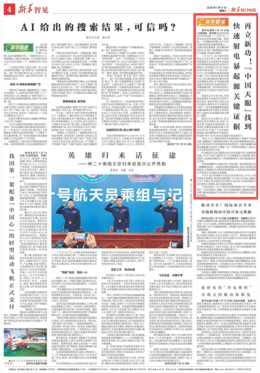 1月17日,《新华每日电讯》刊发文章《再立新功!“中国天眼”找到快速射电暴起源关键证据》,关注我国500米口径球面射电望远镜(“中国天眼”FAST)首次捕捉到重复快速射电暴(FRB)的法拉第旋转量(RM)发生剧烈跃变并随后回落的详细演化过程,为“快速射电暴起源于双星系统”的假说提供了关键观测证据。具体报道如下: