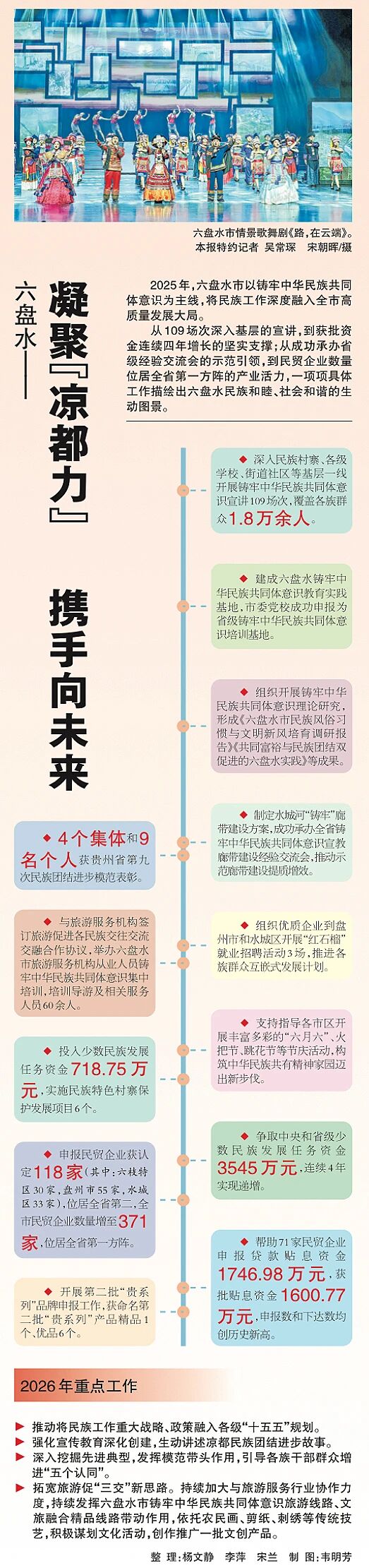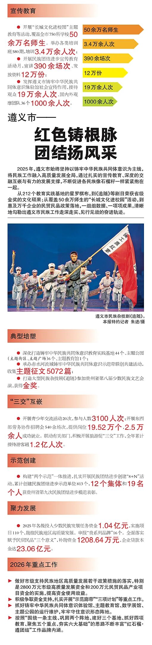 图解·2025年贵州省民宗工作(二) 贵阳市—— 贵阳市——筑城绘同心 聚力谋发展遵义市——红色铸根脉 团结扬风采六盘水市——凝聚“凉都力” 携手向未来 作者: 一审:谭佳雪 二审:缪富霞 三审:林文君