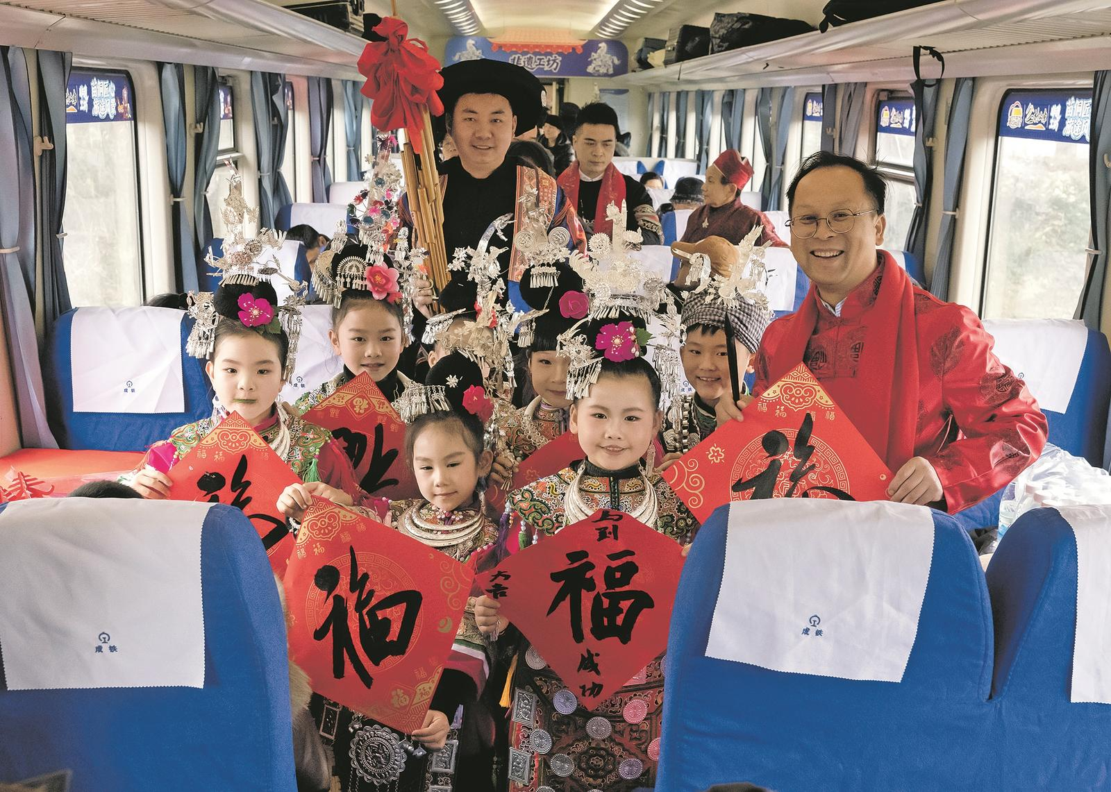 2月8日,5640次“贵州村火车”从贵阳站缓缓驶出,开往凯里,拉开了“热闹中国年·寻味黔东南——2026年坐上‘贵州村火车’回凯里过大年”主题活动的序幕。此次活动通过“列车+市集+非遗+展演”的沉浸式场景,将交通线变为风景线、文化线、惠民线,生动呈现出一幅活力满满、热气腾腾的乡村新画卷。