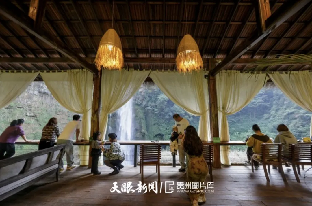 游客在贵阳市开阳县龙岗镇格林村翁洞滩瀑布咖啡店游览 袁福洪 摄